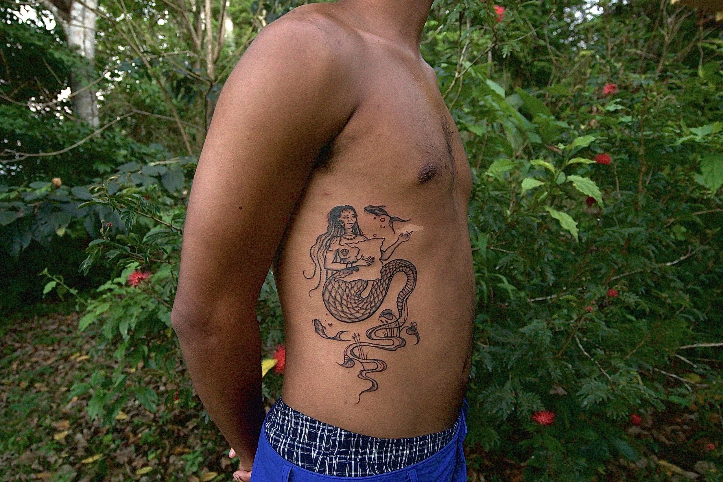 3: yesterday's tattoo for Glenn, a woman turning into a snake, turning into a river, Mama D'leau; ft. a birthmark shaped like Tobago