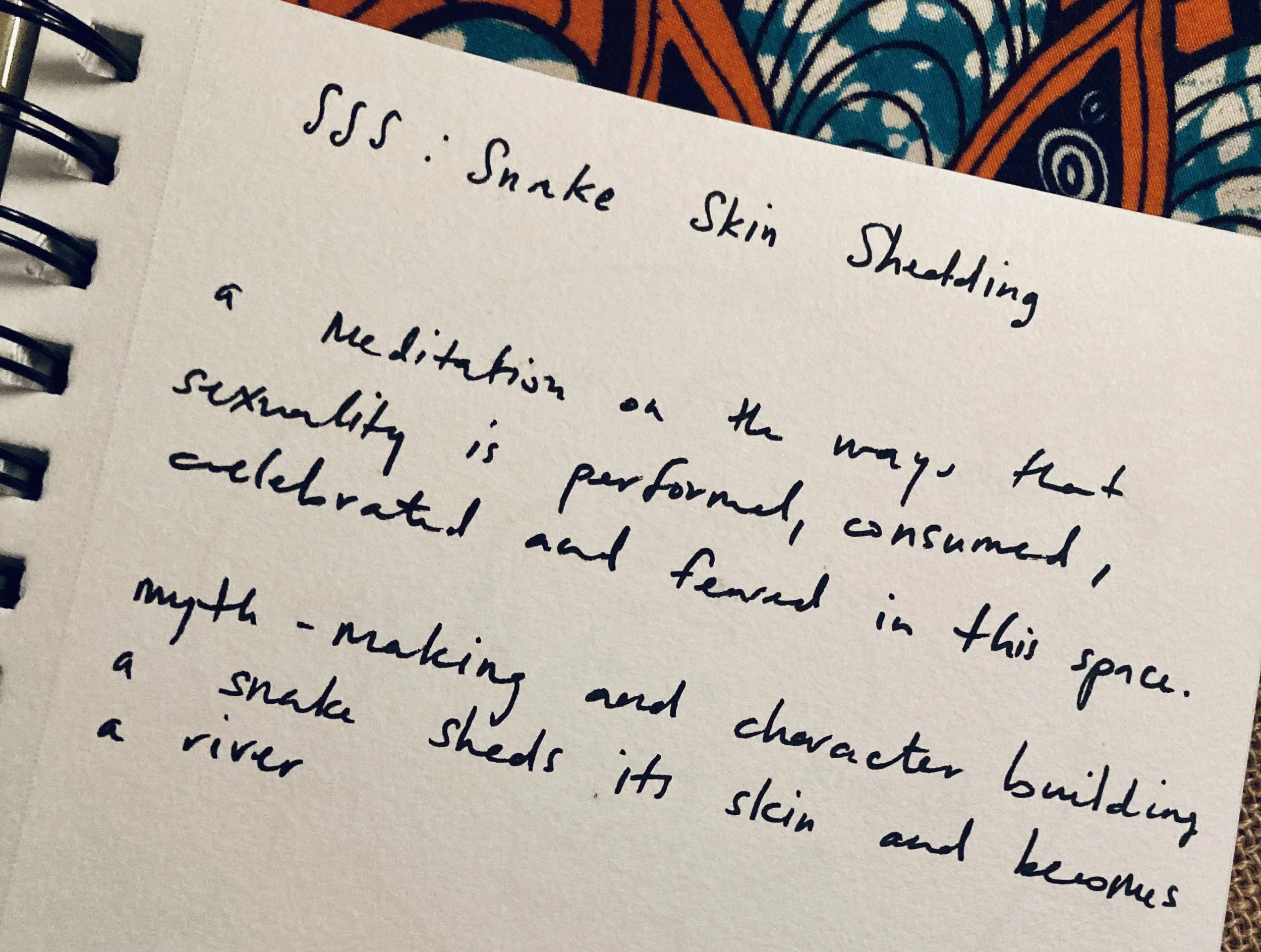 I’m currently researching and experimenting for a work that involves myth-making and character building; in which a snake sheds it's skin and becomes a river.