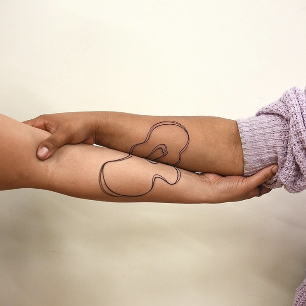 Using tattooing to explore these themes of connection and belonging, I invite pairs of participants to receive tattoos that relate to each other. Operating as a thread that connects the two, each tattoo is a unique, abstract, ‘circular’ shape which becomes another shape when placed next to the other tattoo. The tattoos are offered as unique pairs and are drawn by hand for each participant.