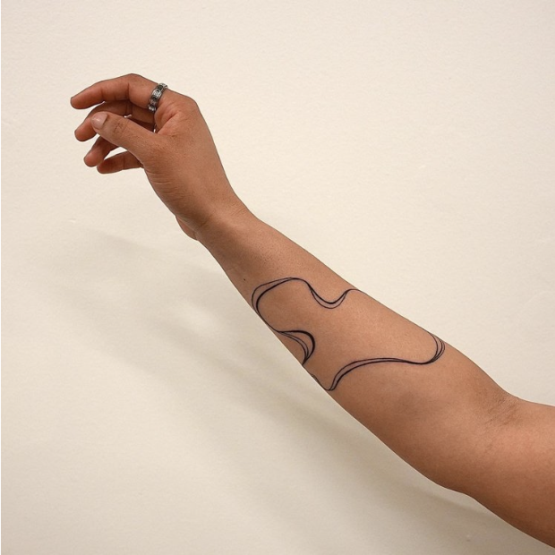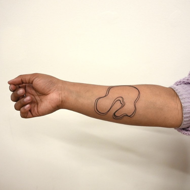 The tattoos that I am offering for this series of works are inspired by my experience of growing up on an islands and the water that surrounds us. For the past few years I have been developing an abstract linework technique in my tattooing practice that is based on the movement of water. The shapes that I create for “I am You,” are completed shapes that have no beginning or end which look like islands or small bodies of water.