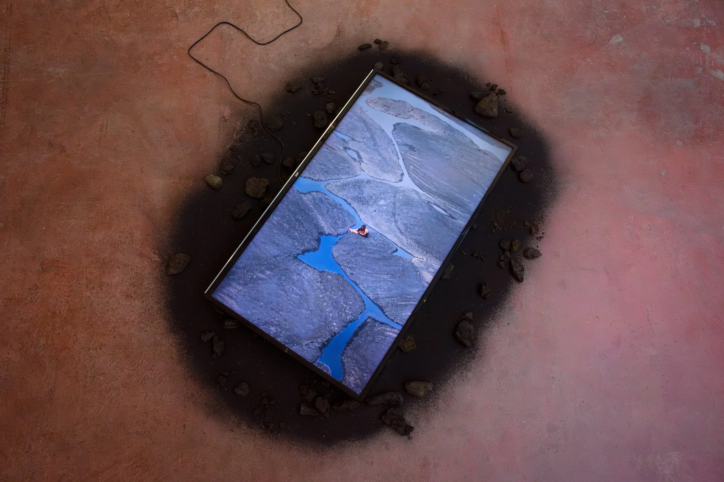“Gesiye's So Will I Turn Her Virtue Into Pitch (2026) touches the core of the expanded idea of the map. Her film lingers over Trinidad's Pitch Lake, the world's largest natural tar deposit, revealing a surface marked by ridges, planes and pools that recall the contours of a traditional map. Rather than treating the landscape as something to be surveyed from a dispassionate and impersonal birds-eye view that we so readily associate with the map-maker, Gesiye situates herself inside it, tattooing her bare legs upon the lake. The Pitch Lake has long been a site of extraction: first exploited under British colonial rule, its tar was used to waterproof ships and later to pave roads across the Empire, including many in London. The lake continually regenerates itself, making it seem untouched even as it is endlessly mined; a surface that keeps being extracted, while remaining a wellspring of spirit and belonging for those who live amongst it.